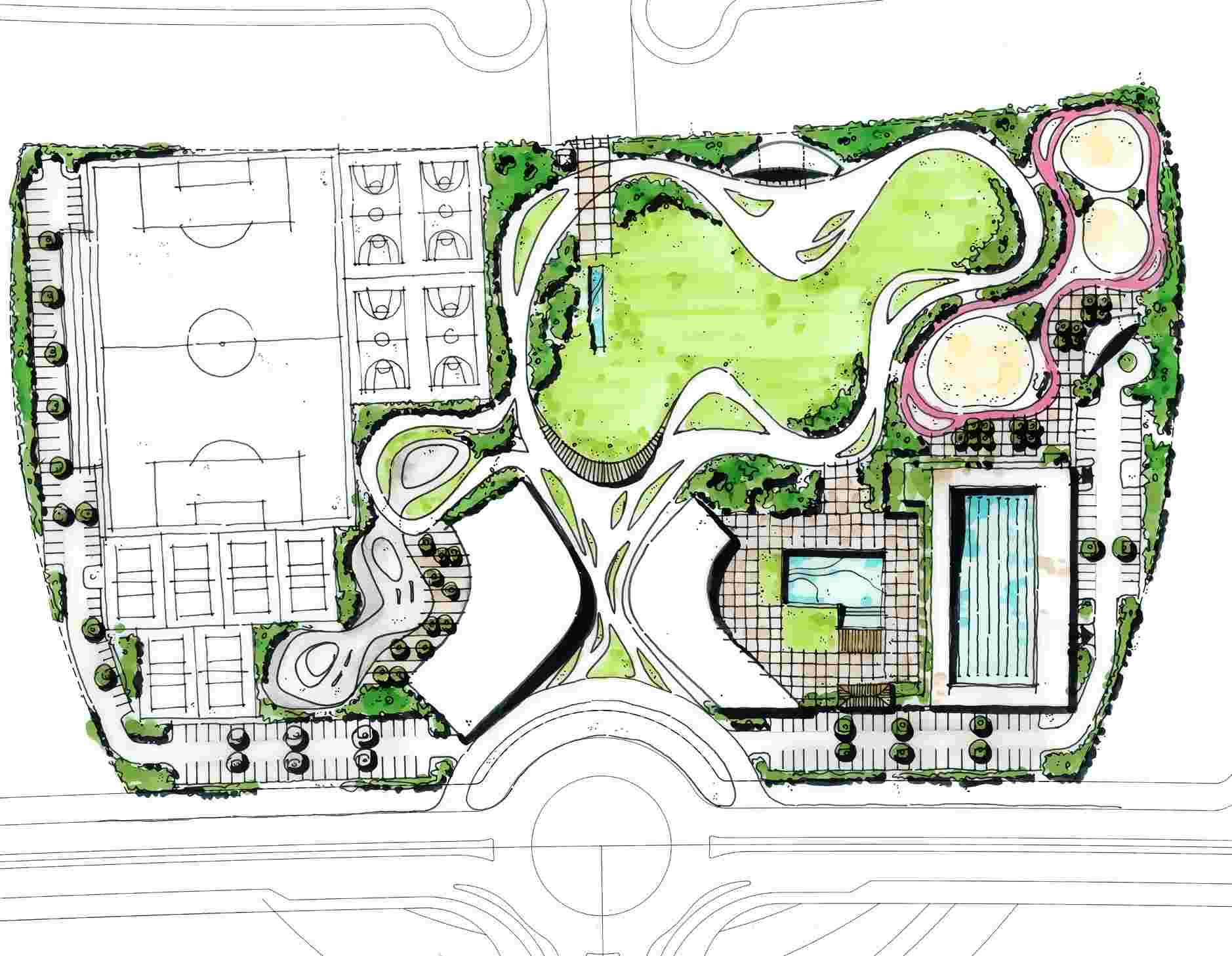 The aquatic complex serves as the visual and emotional centerpiece. A 50-meter Olympic pool is complemented by leisure pools and a children’s splash zone, all oriented for optimal sunlight and protected by landscaping buffers. Adjacent terraces and a snack bar invite relaxation and socializing, while architectural features like the diving platform add both drama and functionality.