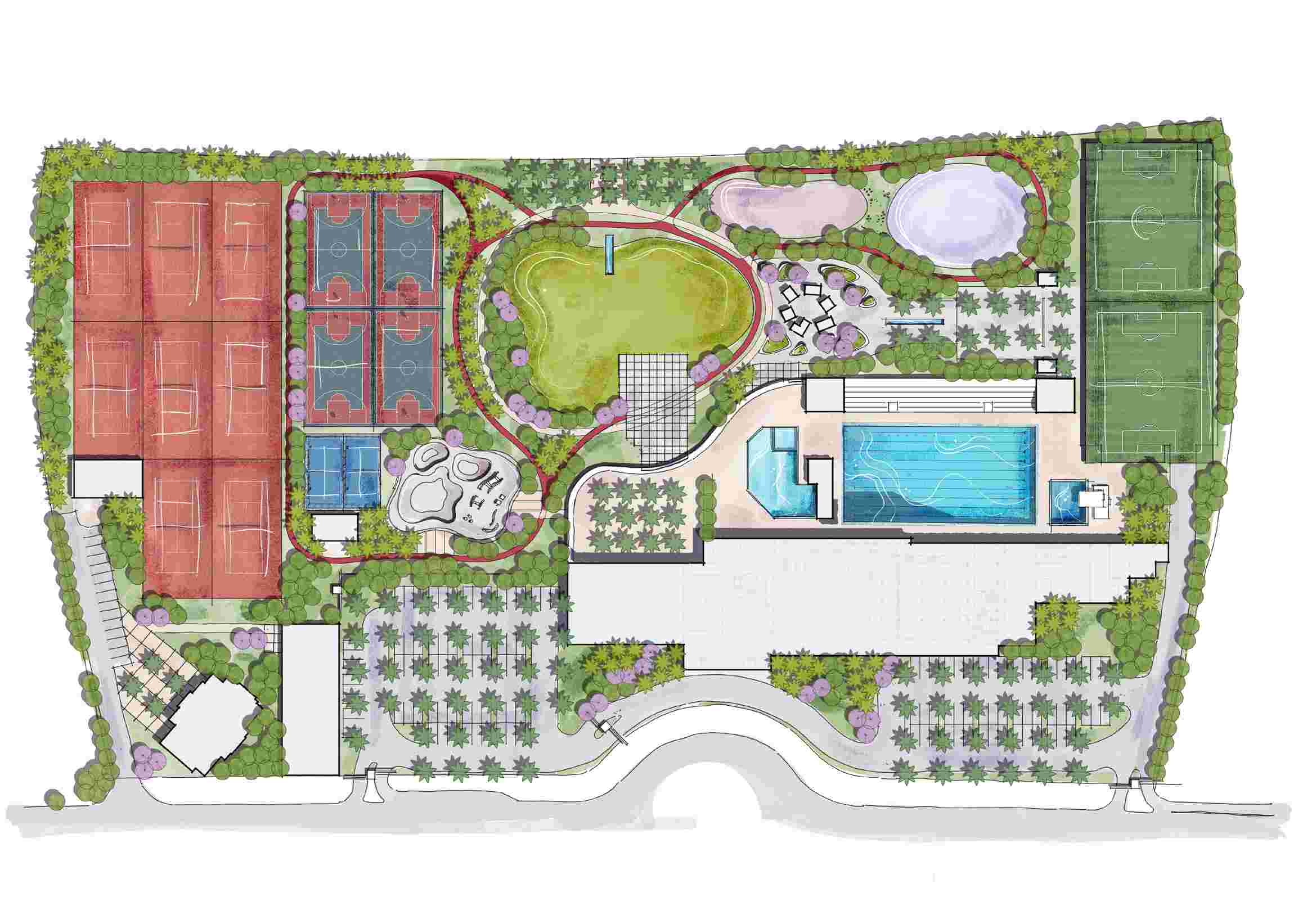 Planned in phases, the club first delivers core athletic and aquatic facilities alongside necessary infrastructure, with social buildings and indoor centers to follow — allowing growth in harmony with community needs.