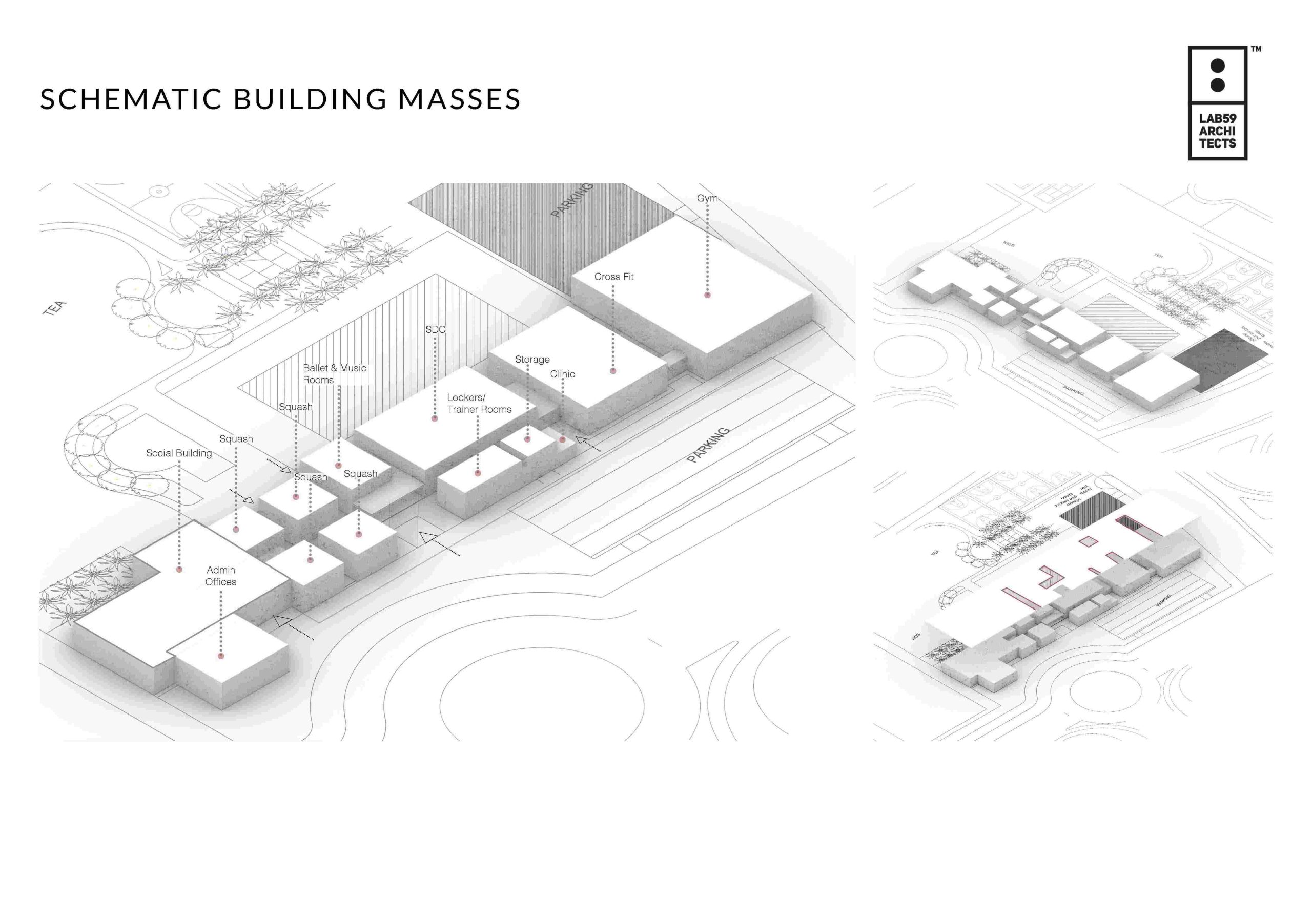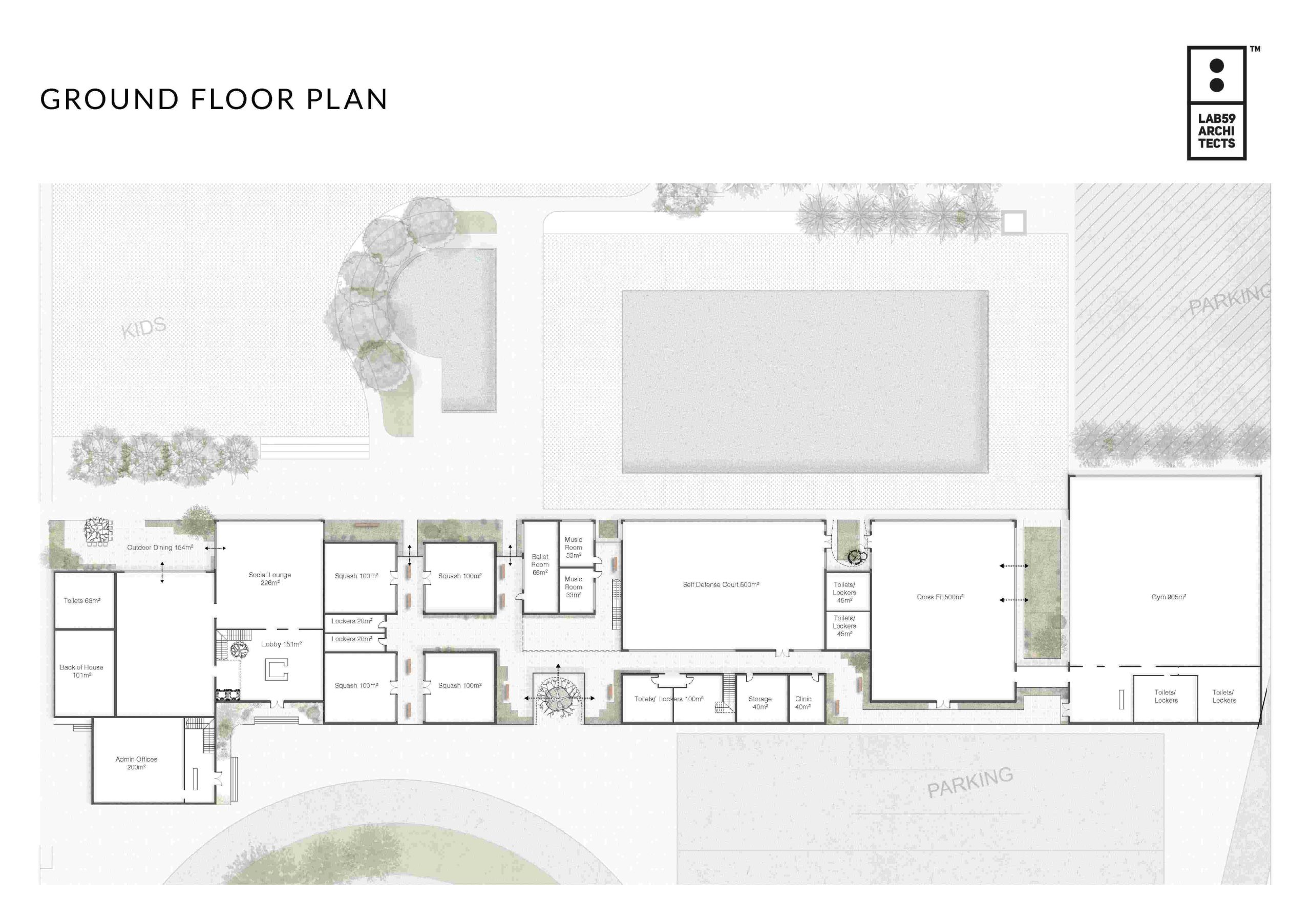 At the core, sleek modern structures with transparent façades and generous overhangs blur indoor and outdoor boundaries. The wellness pavilion, positioned in a quiet garden, supports physiotherapy, meditation, and spa treatments — complementing the nearby healthy café and cross-fit area to promote holistic wellbeing.