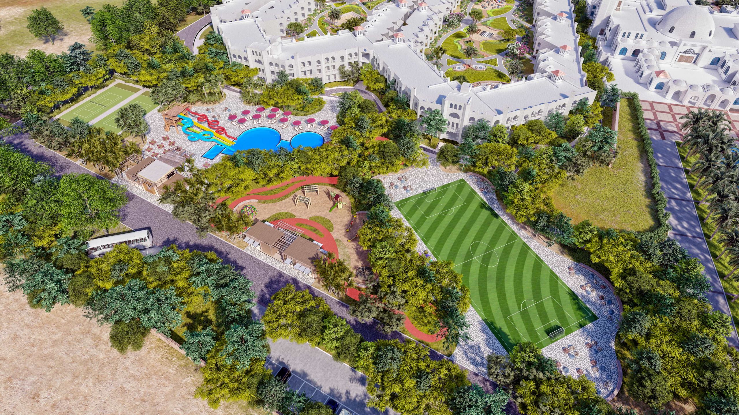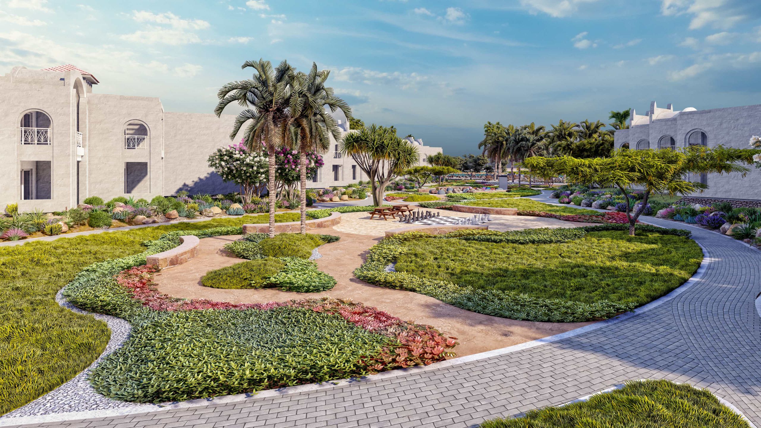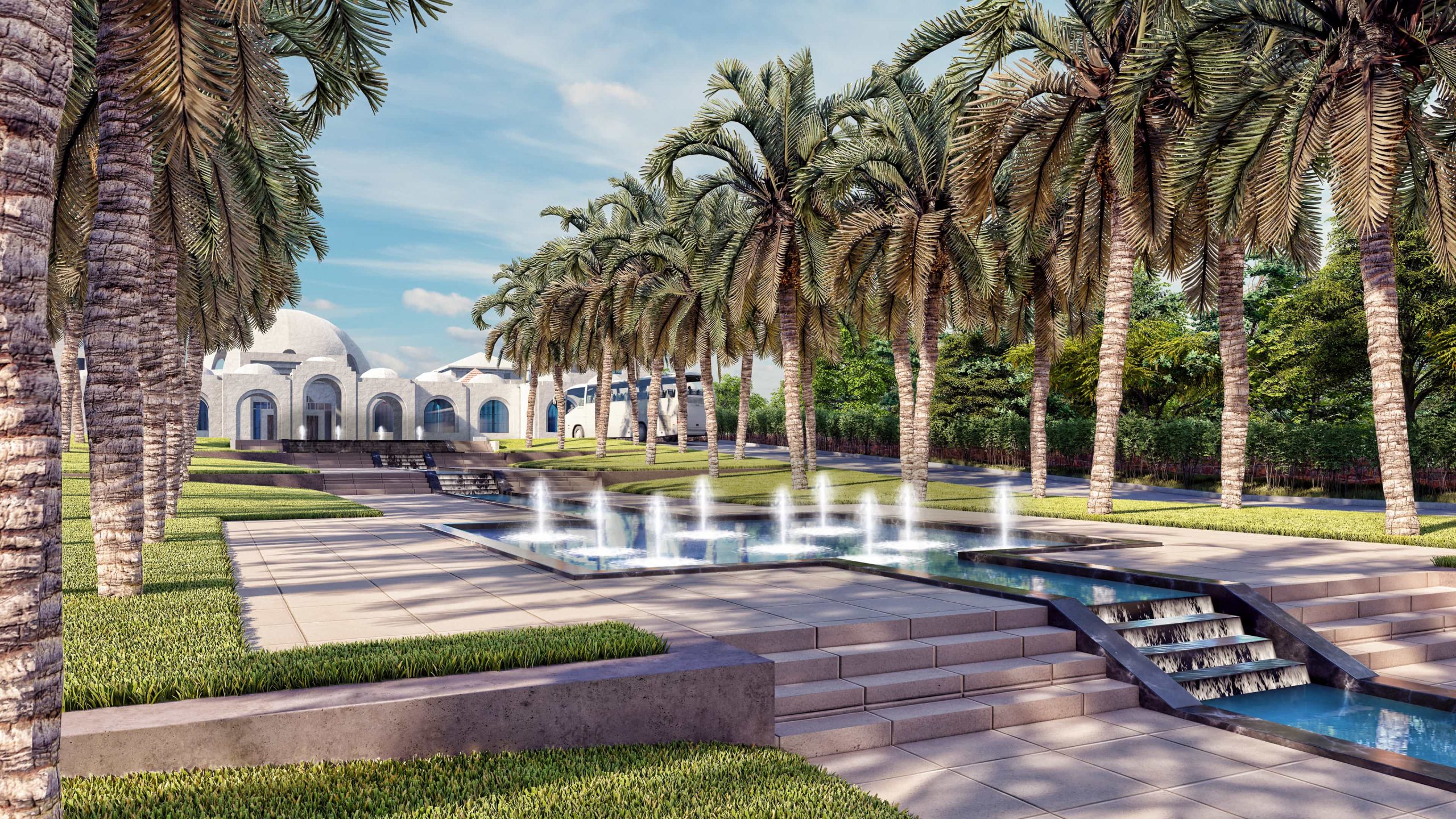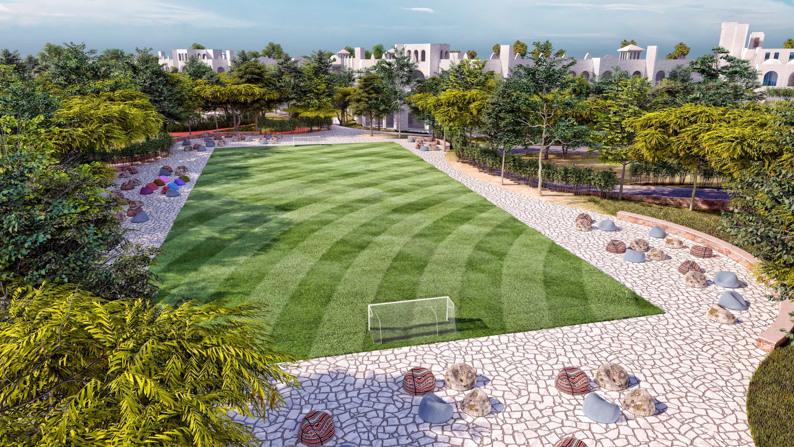 Our innovative design approach addressed key challenges posed by the region’s hot climate, limited water availability, and scarce natural shading. Through the careful selection of resilient, drought-tolerant plant species adapted to the site’s unique weather conditions, we created a sustainable and visually stunning landscape that thrives in harmony with its environment.