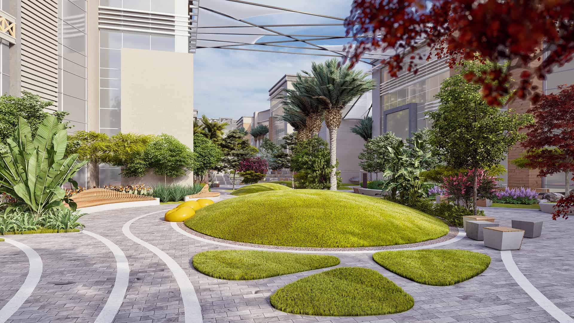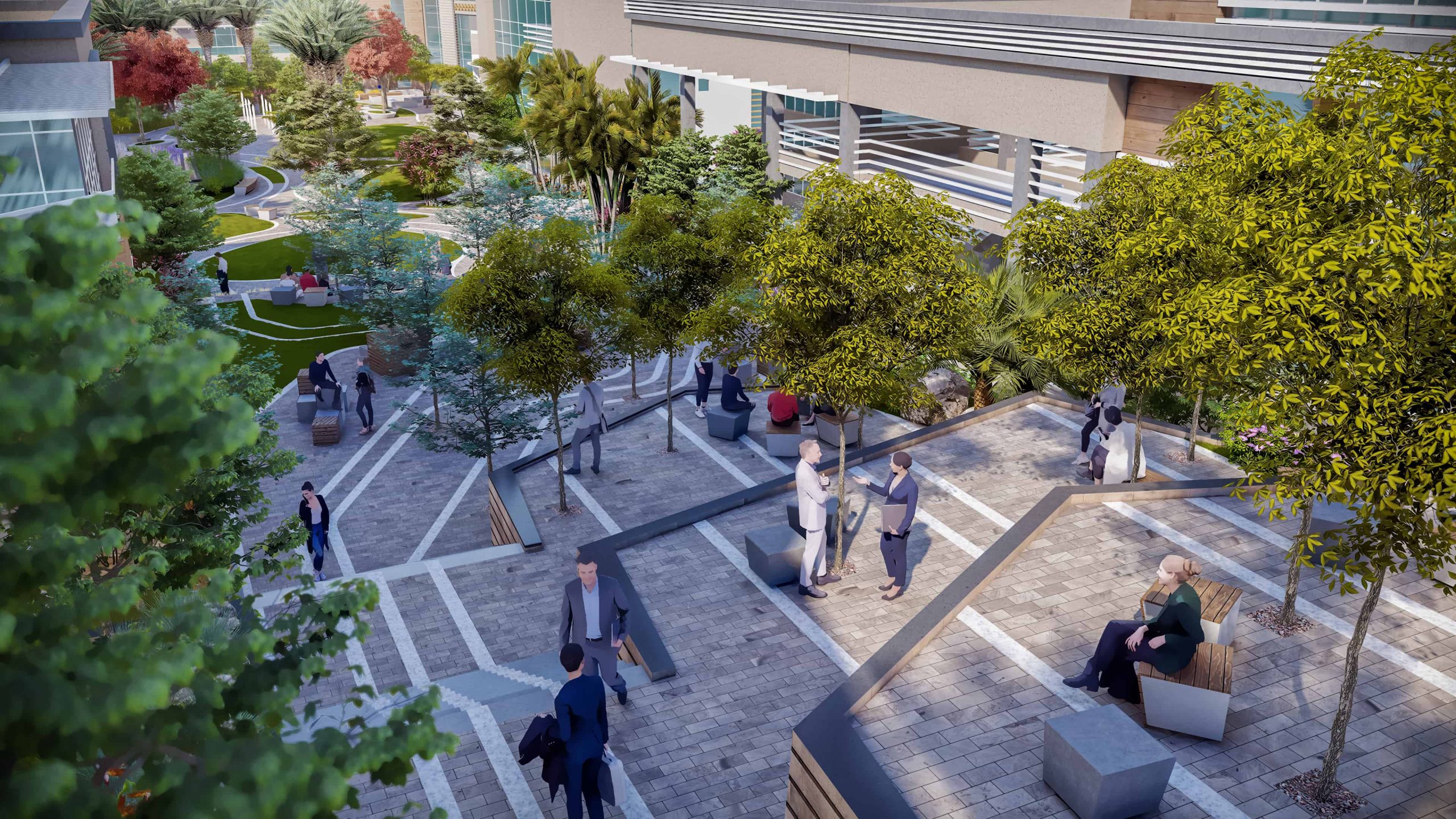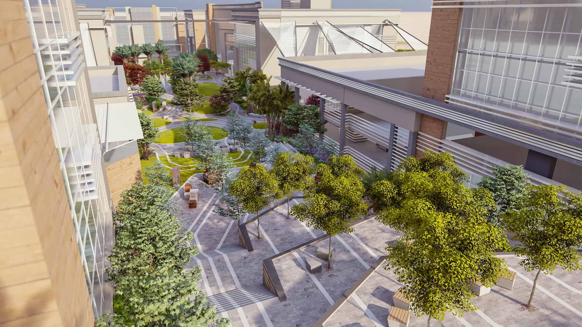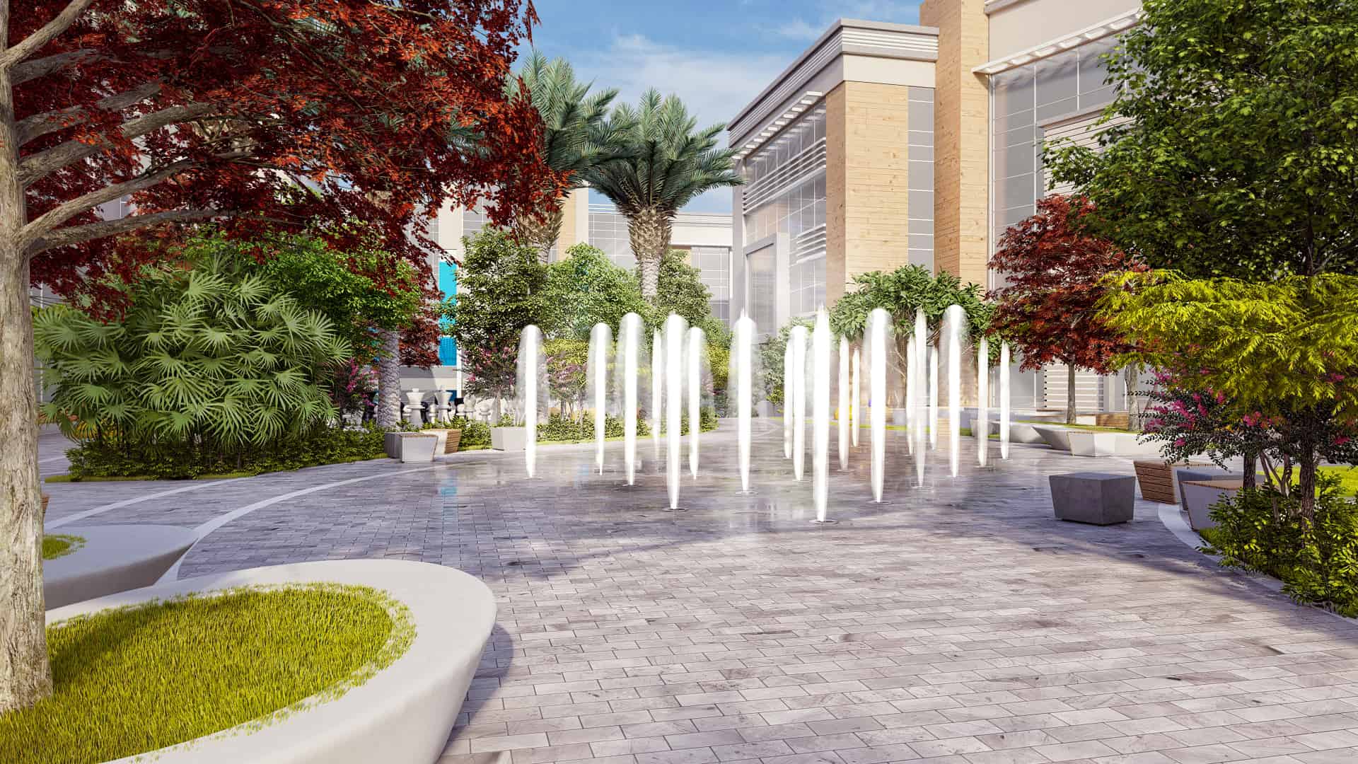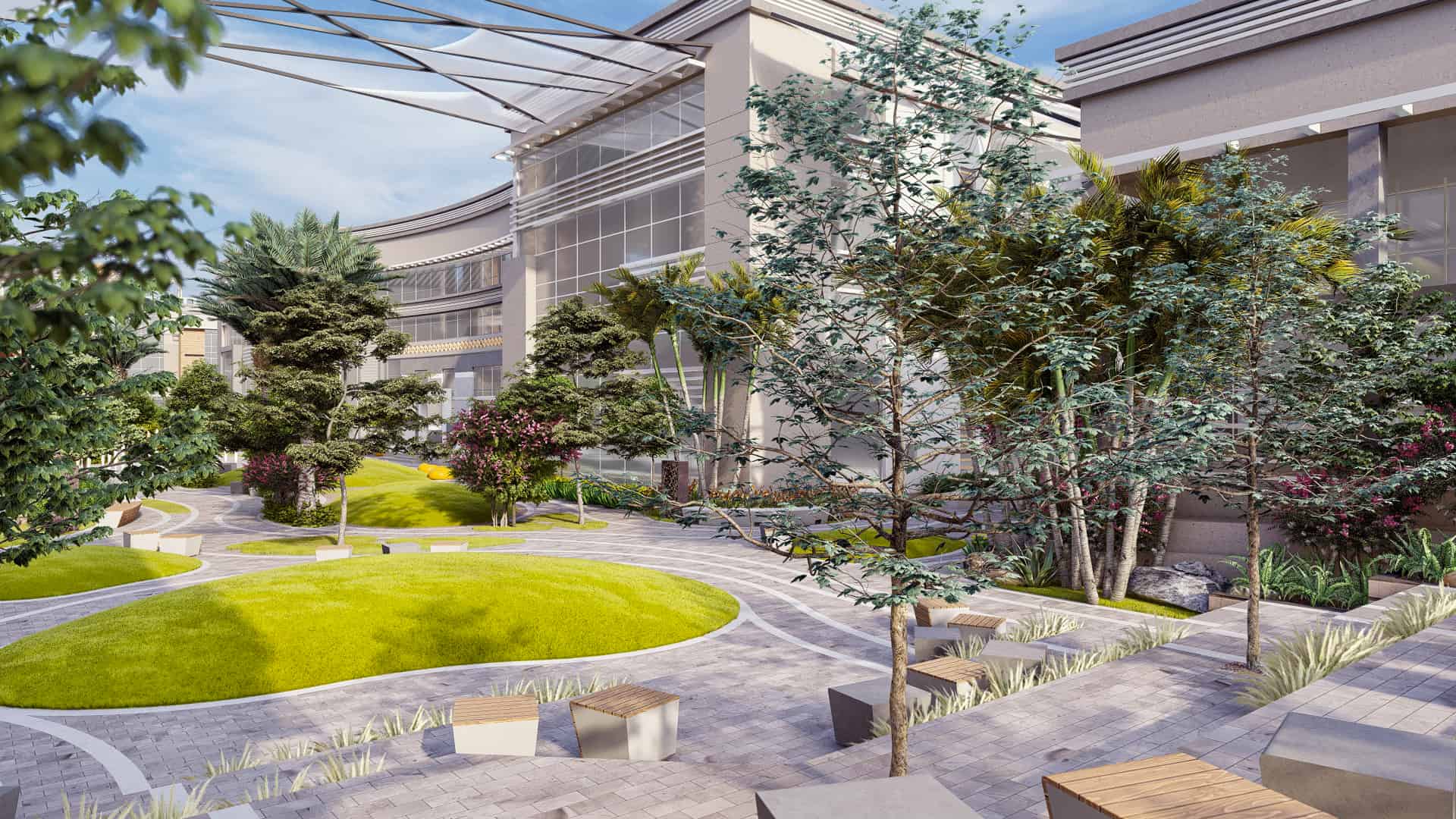 Schaduf’s concept was inspired by the NTA’s mission to develop well-rounded individuals who learn through interaction with both society and the environment. The landscape design translated this philosophy into a journey of transformation across the site’s natural topography. The campus is structured around four main experiential zones—“The Gateway,” “The Brain,” “The Transition,” and “The Unity”—each representing a stage in the learner’s developmental journey. The experience begins at The Gateway, the northernmost and highest point of the site, where users are welcomed by a tranquil fountain and a panoramic view over the campus. This entry zone serves as a formal arrival point that transitions from the outer city’s bustle into an atmosphere of calm reflection.