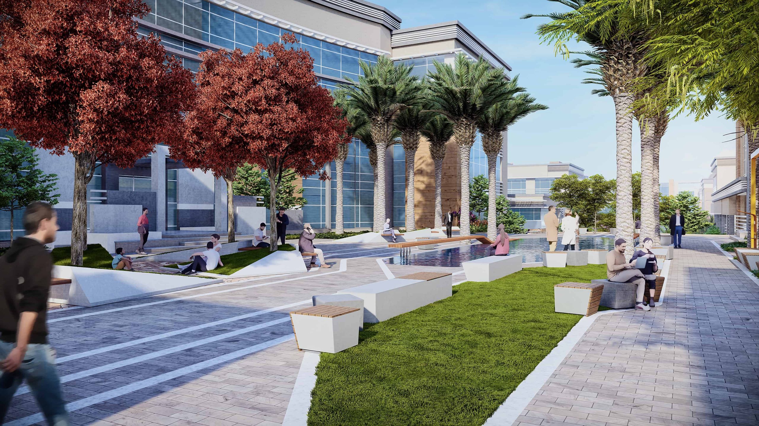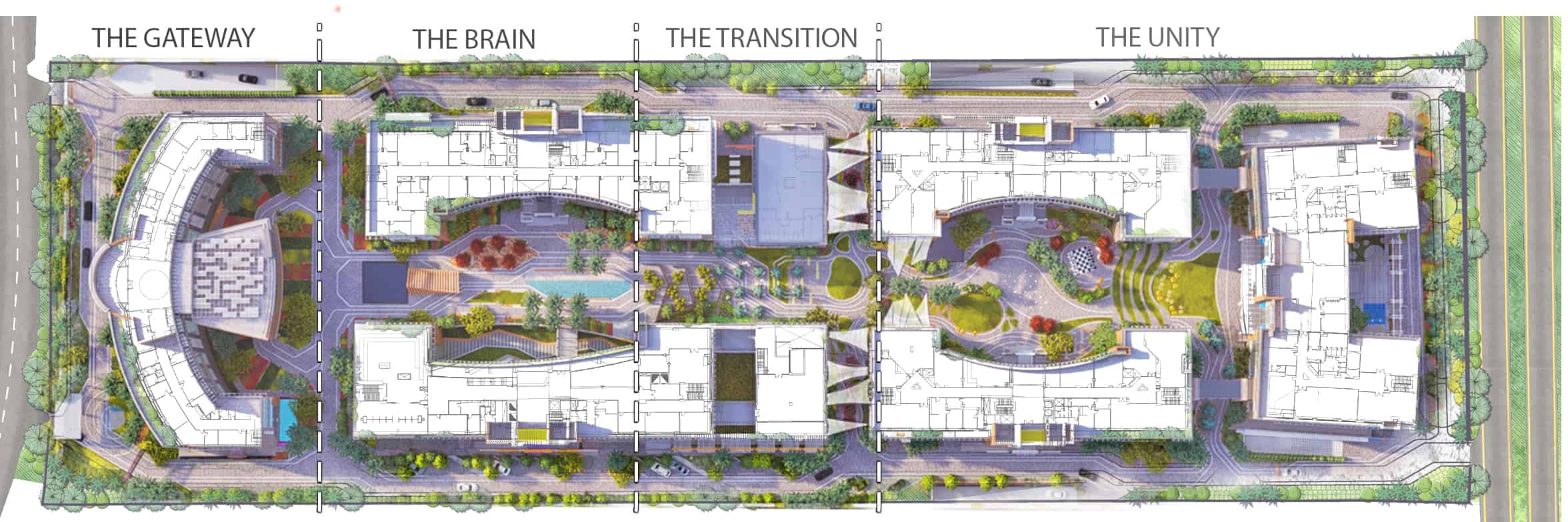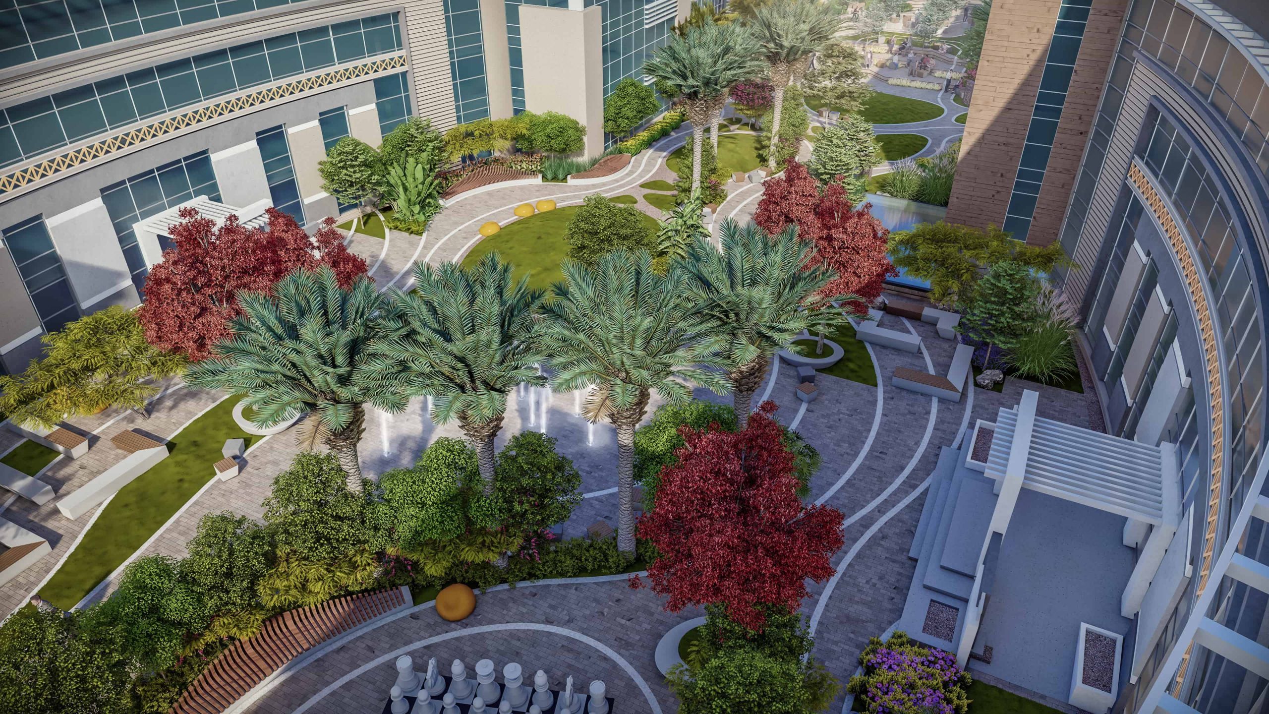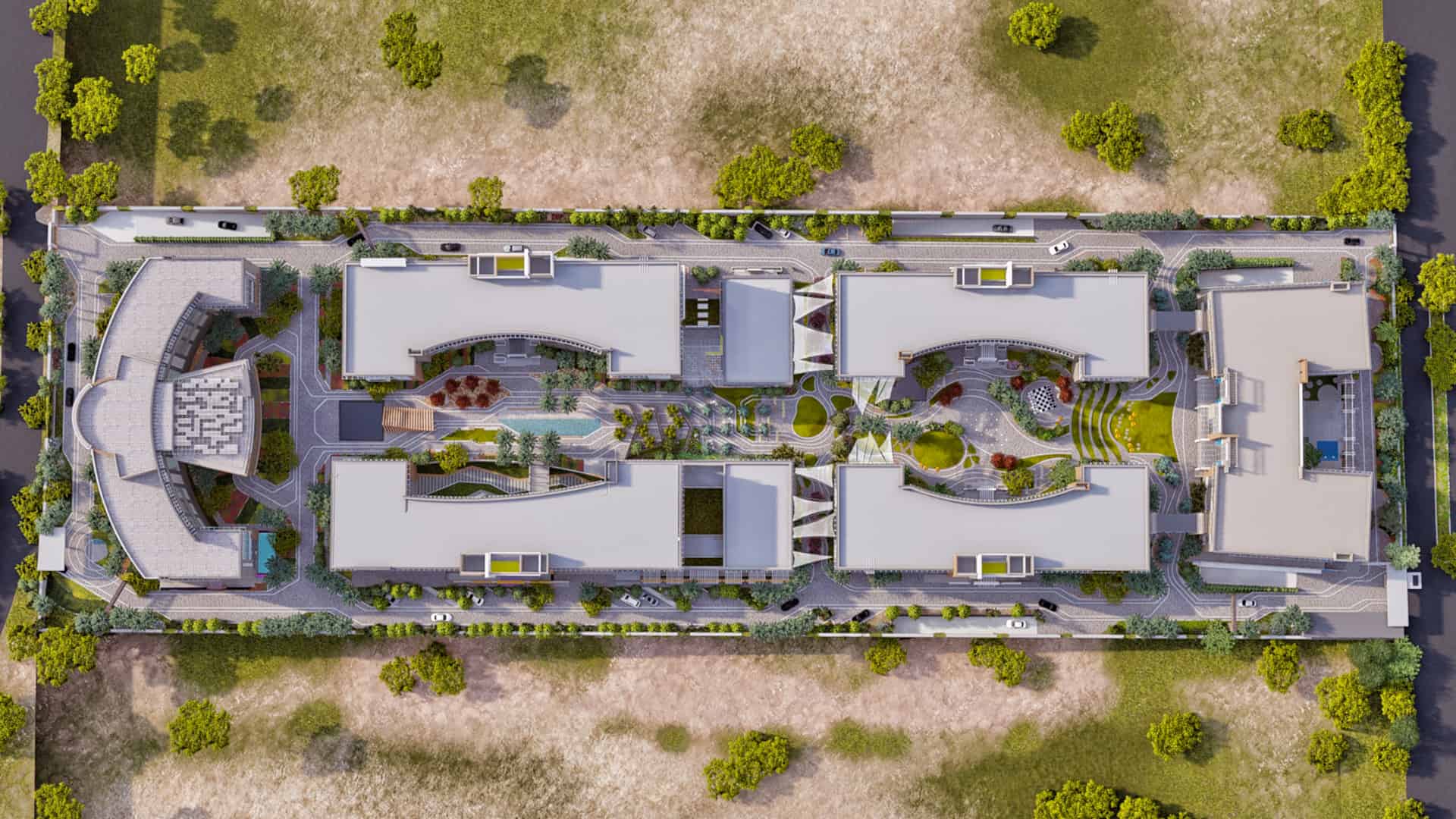 Schaduf’s concept was inspired by the NTA’s mission to develop well-rounded individuals who learn through interaction with both society and the environment. The landscape design translated this philosophy into a journey of transformation across the site’s natural topography. The campus is structured around four main experiential zones—“The Gateway,” “The Brain,” “The Transition,” and “The Unity”—each representing a stage in the learner’s developmental journey. The experience begins at The Gateway, the northernmost and highest point of the site, where users are welcomed by a tranquil fountain and a panoramic view over the campus. This entry zone serves as a formal arrival point that transitions from the outer city’s bustle into an atmosphere of calm reflection.