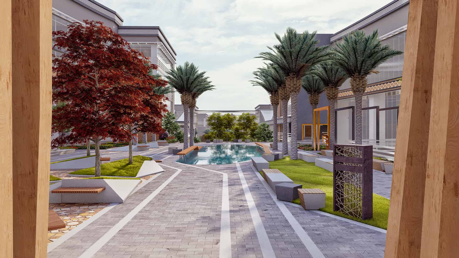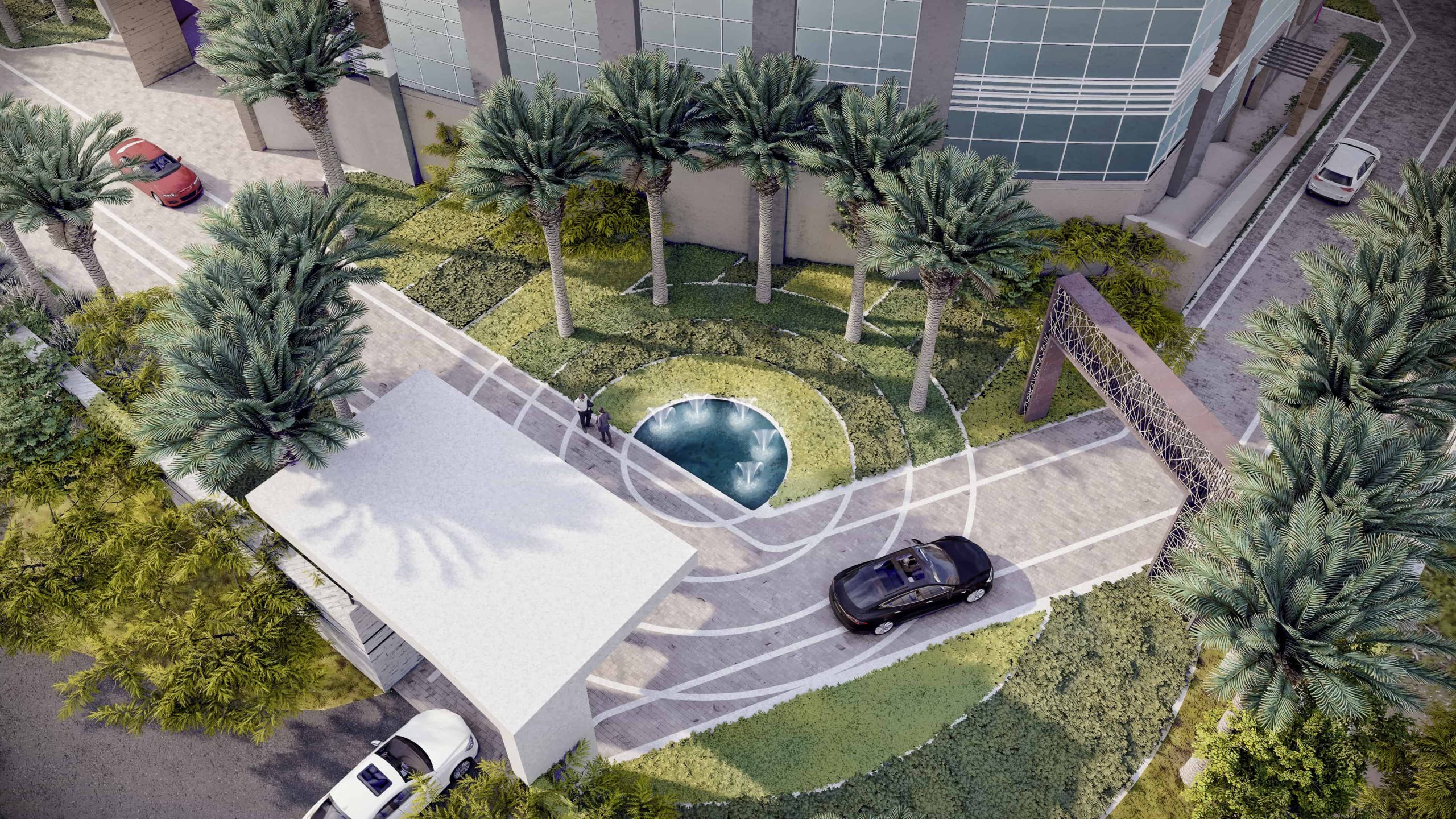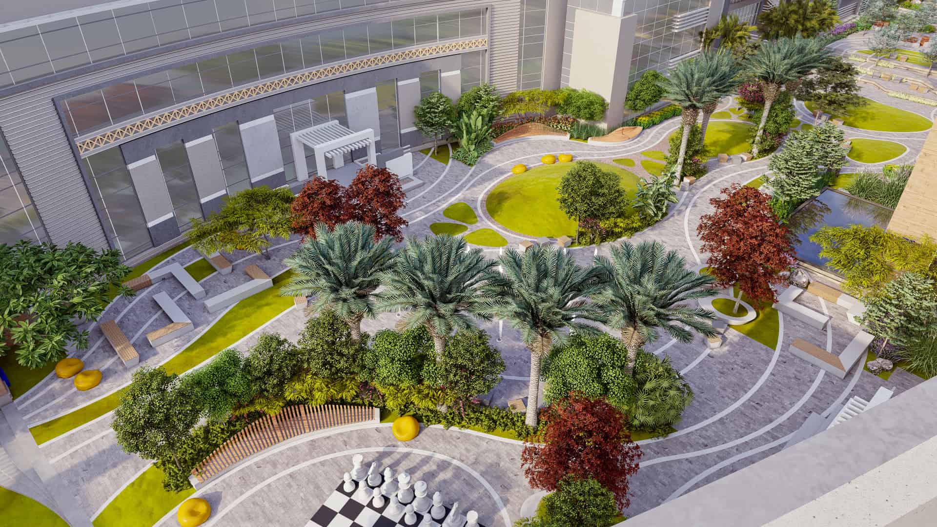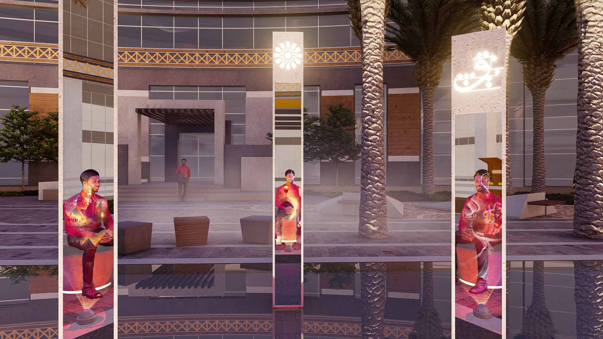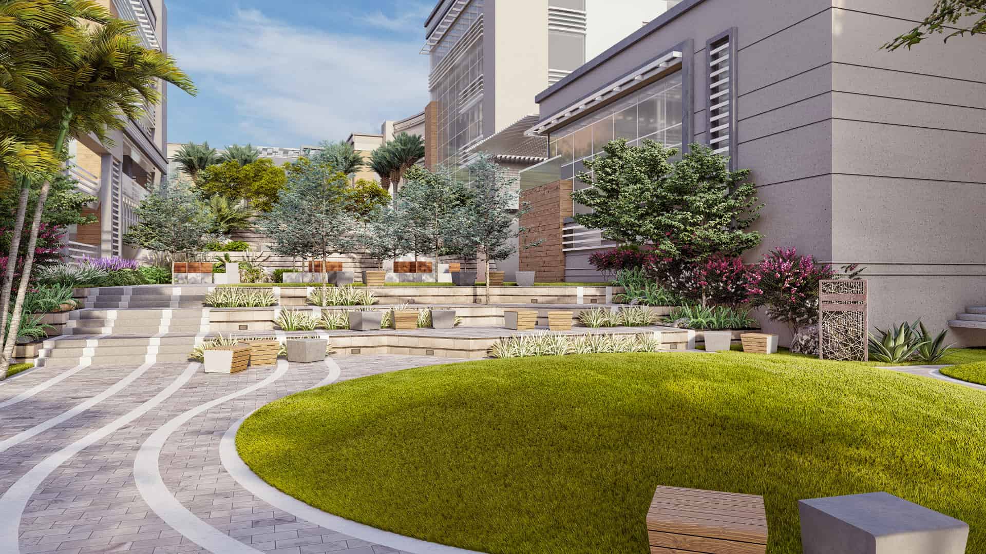 Schaduf’s concept was inspired by the NTA’s mission to develop well-rounded individuals who learn through interaction with both society and the environment. The landscape design translated this philosophy into a journey of transformation across the site’s natural topography. The campus is structured around four main experiential zones—“The Gateway,” “The Brain,” “The Transition,” and “The Unity”—each representing a stage in the learner’s developmental journey. The experience begins at The Gateway, the northernmost and highest point of the site, where users are welcomed by a tranquil fountain and a panoramic view over the campus. This entry zone serves as a formal arrival point that transitions from the outer city’s bustle into an atmosphere of calm reflection.