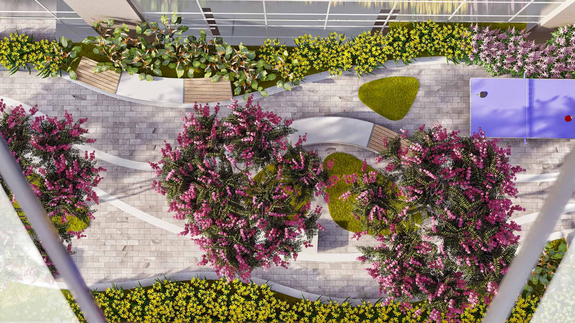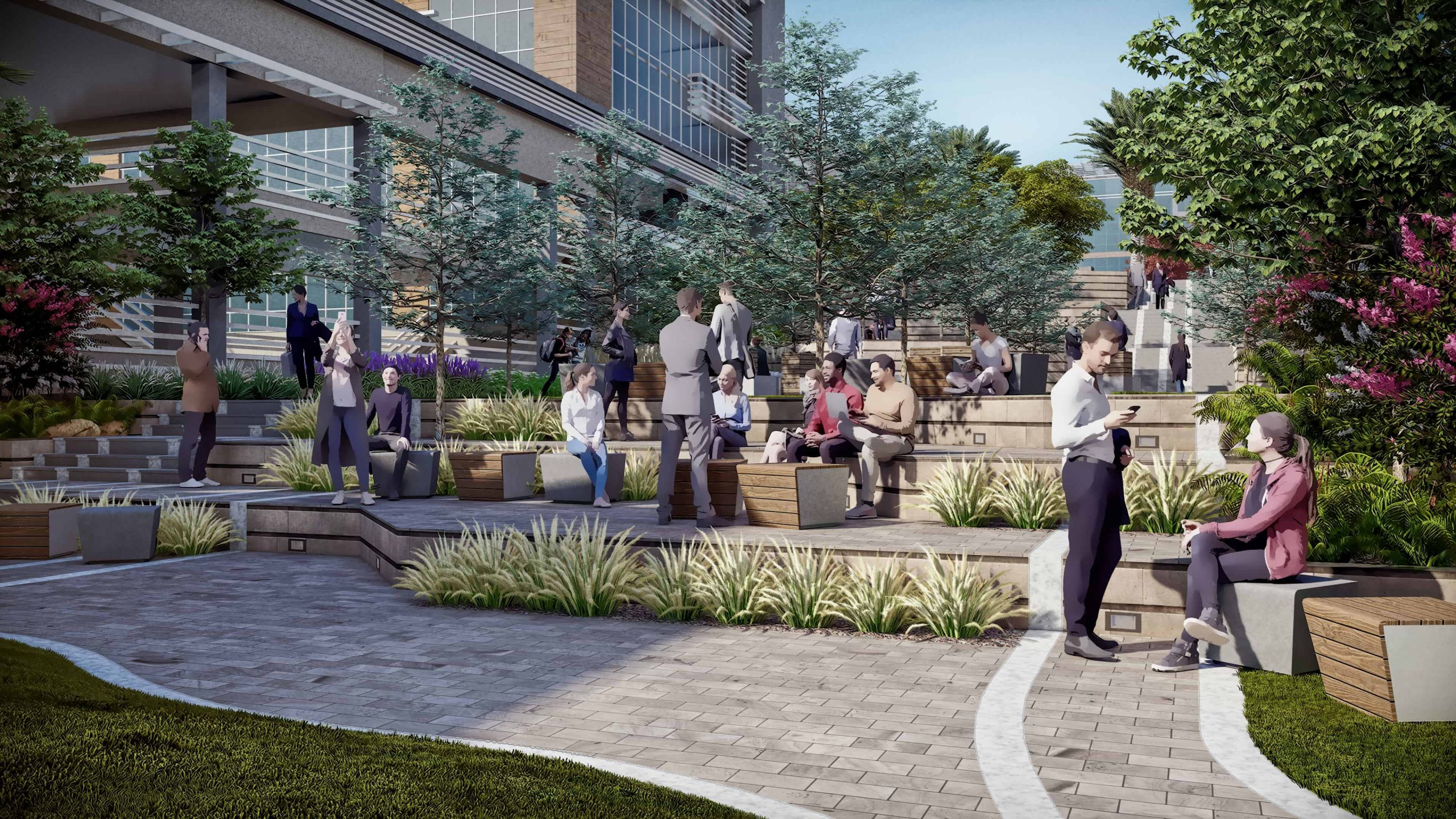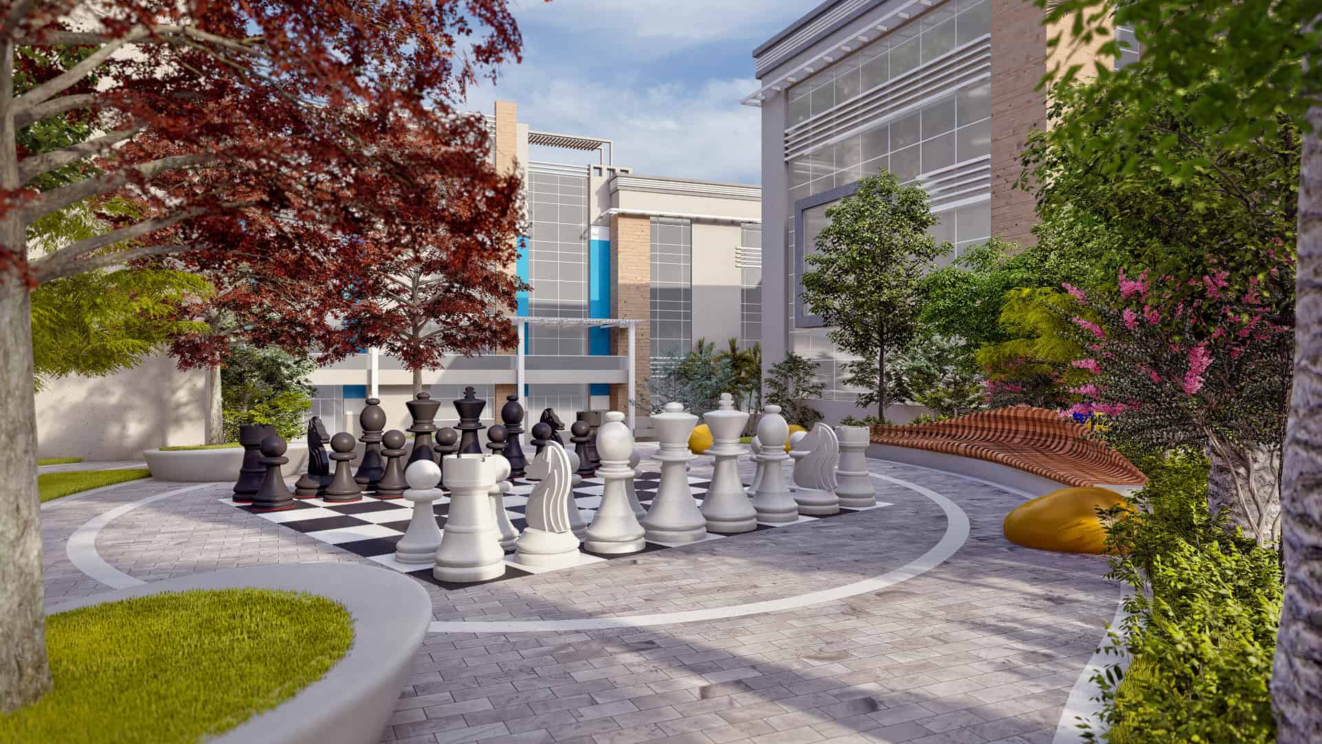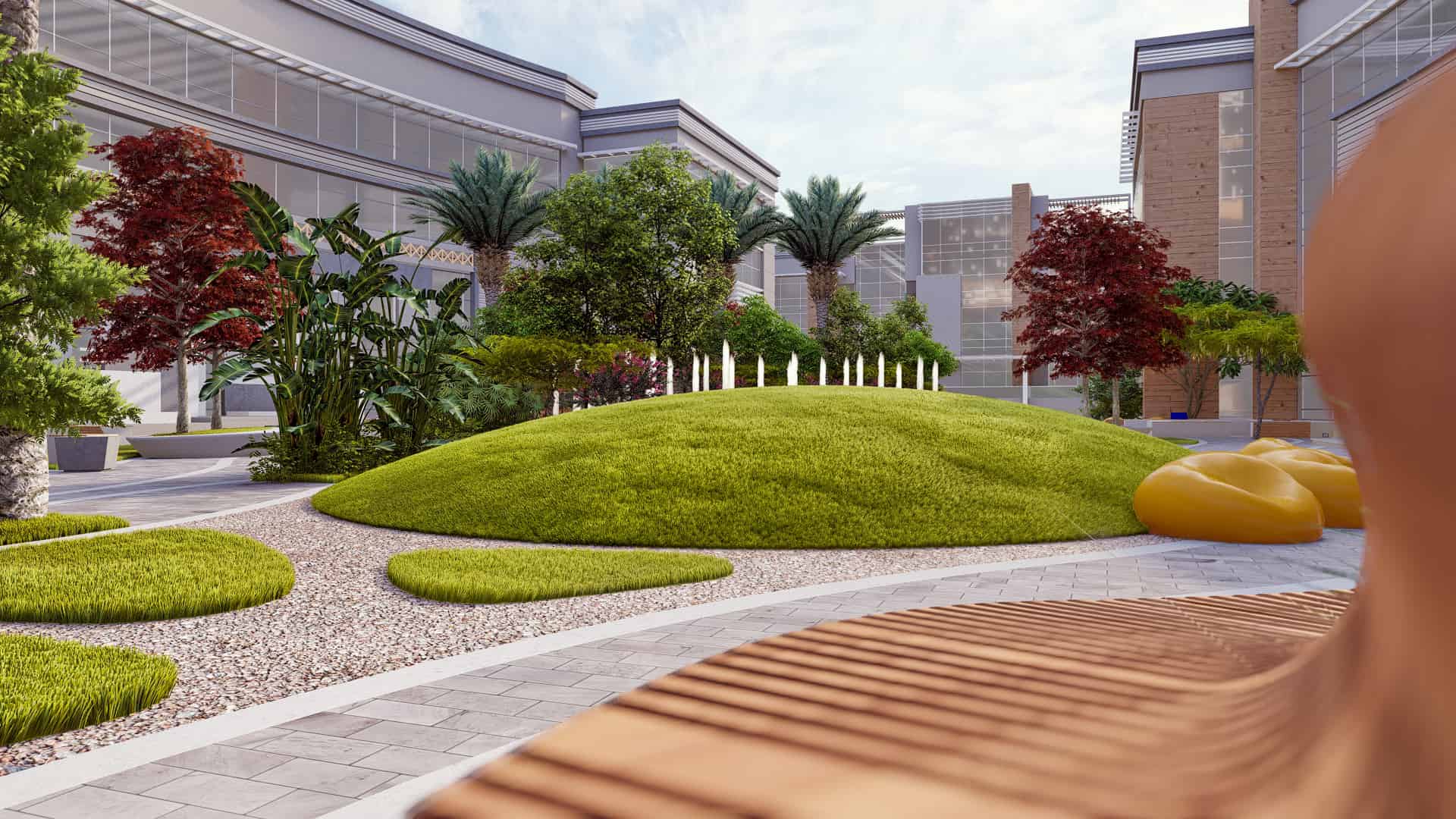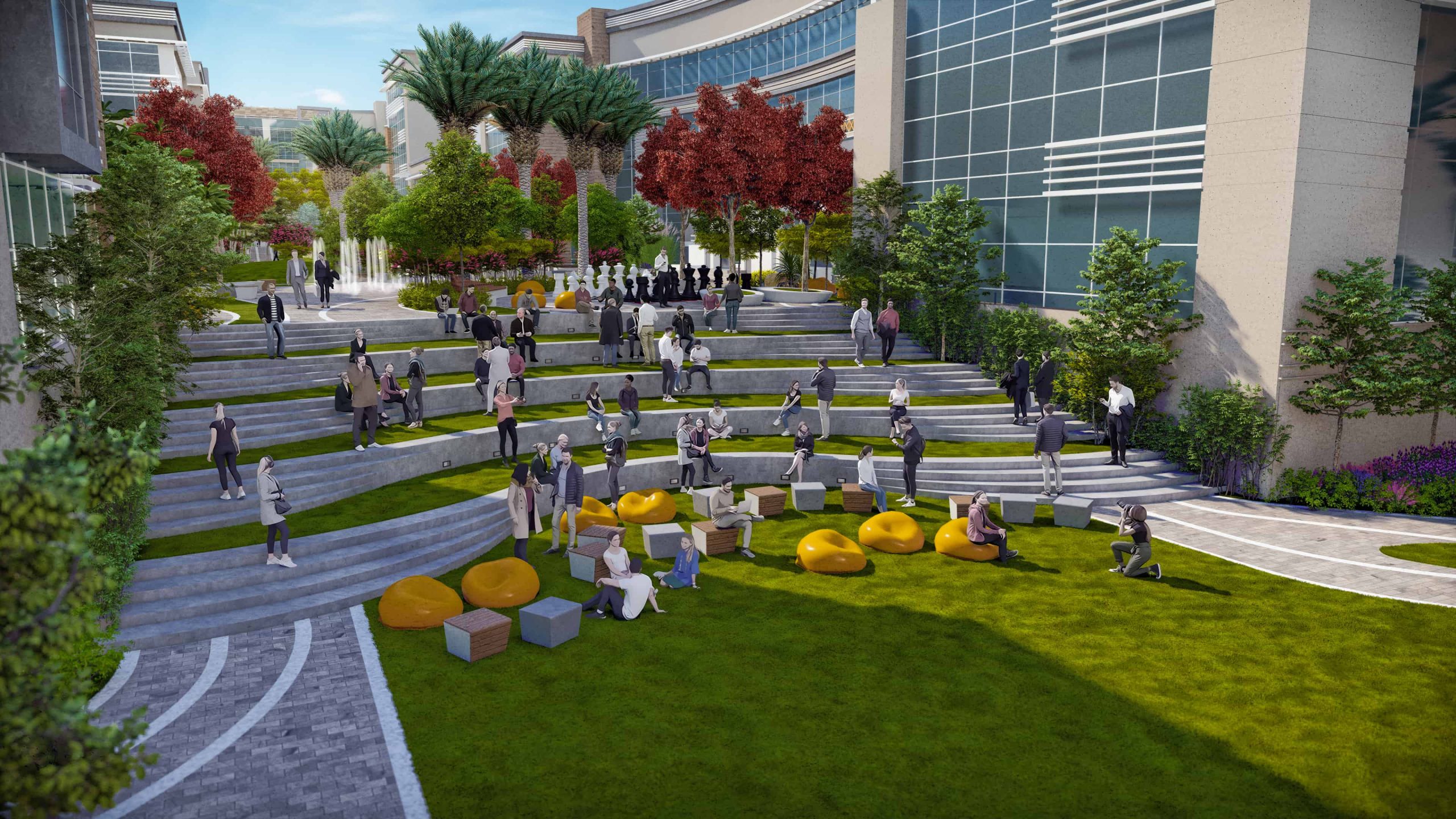 At the lowest point of the site lies The Unity zone, a forested plaza designed for networking, informal exchange, and recreation. The plaza’s dry-deck fountain and variable seating options—benches, bean bags, and grassy slopes—encourage interaction between diverse teams and disciplines. The area culminates in a grand amphitheater carved into a five-meter slope, capable of seating up to 200 attendees for performances, speeches, and large-scale events.
