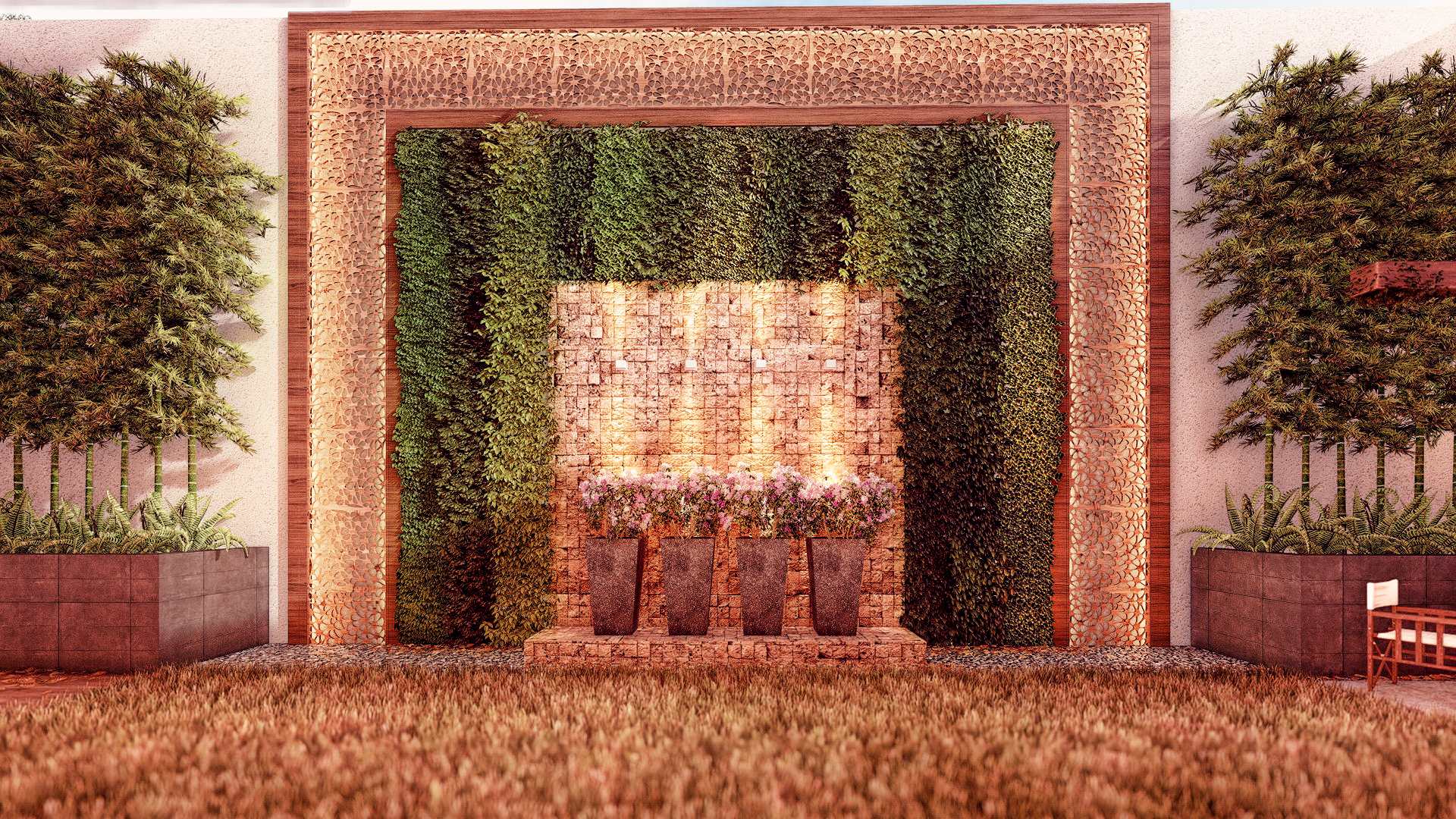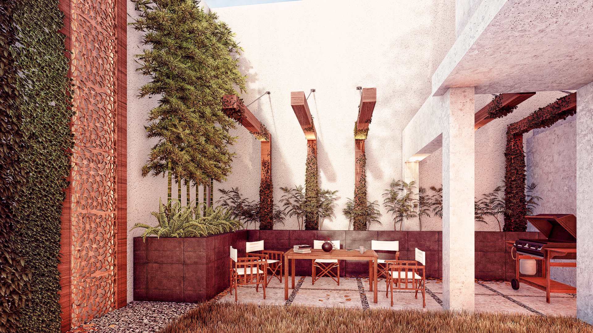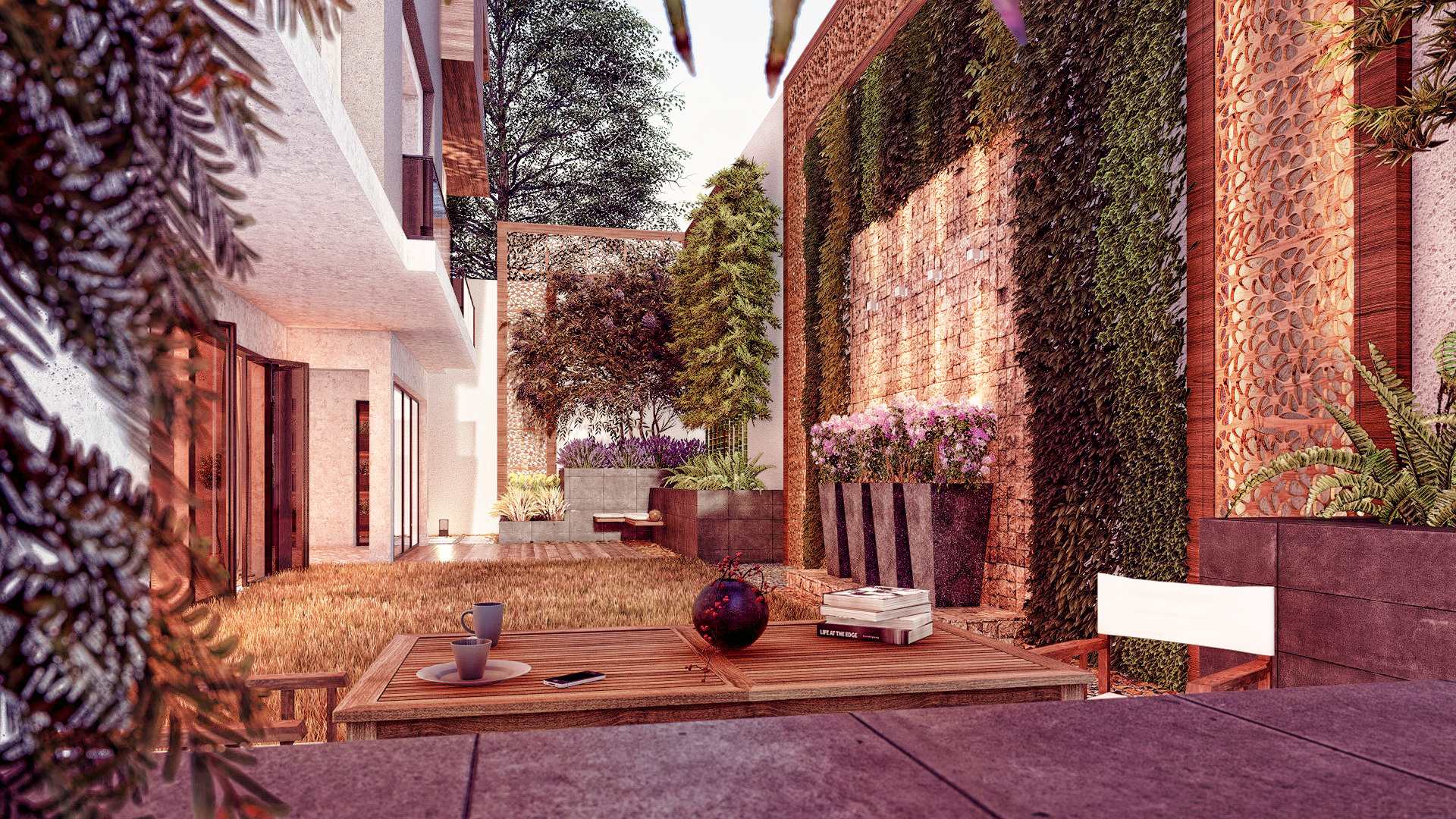 Our team carefully curated a palette of shade-tolerant and resilient plant species, including productive fruit trees and edible herbs that support the villa’s daily needs, blending practicality with lush greenery. As night falls, the interplay between subtle lighting, fragrant plants, and the villa’s interior creates a rich and inviting atmosphere—transforming the compact outdoor space into a tranquil sanctuary.